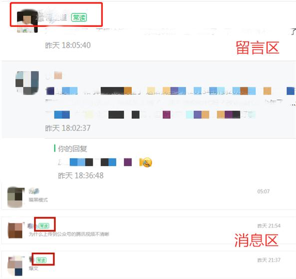 从截图可看出,调整后的留言区与消息区都将公众号的常读用户都标上绿色的“常读”图标,如此一来运营者可通过绿标更具体地了解留言区哪些人为自己公众号的常读用户。(这不类似微博的“铁粉”吗?)
