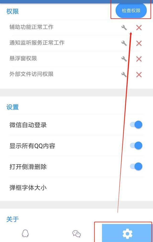好了说正事!其实方法超级简单,进入后点击"设置",你就会在上方看到一个"检查权限",点击它看看,就会自动检测有哪些权限没有开启。 如果你看见红色的"×",只需要点击旁边的扳手,然后将其权限全部打开(直到全部变成绿色的"√"就可以啦!)