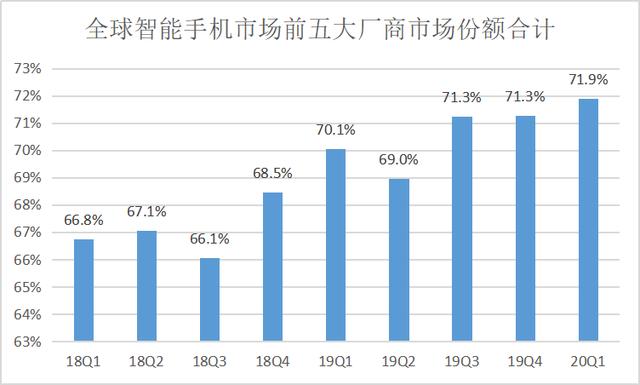2018年一季度的时候,前五大厂商的全球市场份额合计还只有66.8%,此后几乎是一路攀升。到了2020年一季度,前五大的市场份额已经增长到71.9%,足足增加了5.1个百分点。