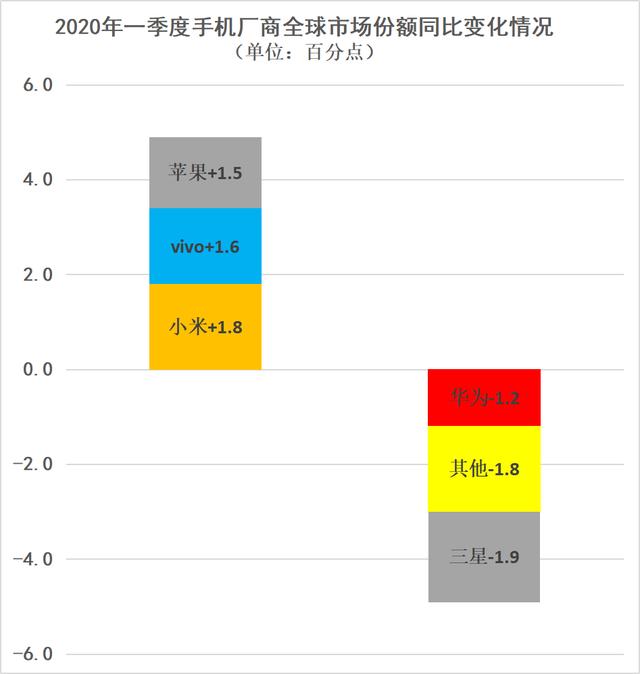 从全球市场来看,前两大厂商三星和华为并没能扩大战果,市场份额均有所减少;反而让后面的苹果、小米、vivo分别掠走了1.5-1.8个百分点的市场份额,其中小米的战果最好,市场份额增加了1.8个百分点。
