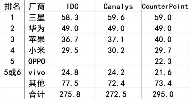 从上图可以看出,虽然三大研究机构发布的出货量数据不完全一致,不过在各大手机厂商的排名上,三大研究机构的前四名均为三星、华为、苹果和小米,只是在第五名上发生了分歧: