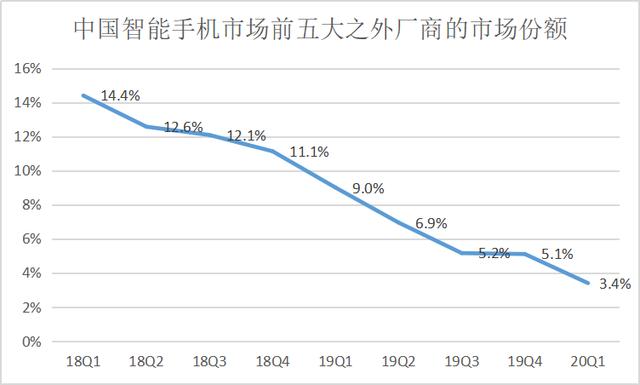 看完上图之后,估计很多朋友跟老冀一样完全惊呆了:在过去的两年里,其他手机厂商的市场份额一路被挤压,到了2020年一季度,竟然只剩下可怜的3.4%了!