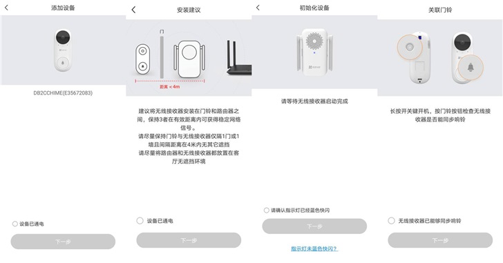 通过App扫描机身或说明书上的二维码,确认设备是否通电后,即可将门铃添加至App当中,此时App向用户说明:建议将无线接收器安装在门铃和路由器之间,保持三者在有效距离内可获得稳定网络信号。App还建议门铃与无线接收器尽量在4米内无其他遮挡,不过具体可以根据实际安装情况自行调整。