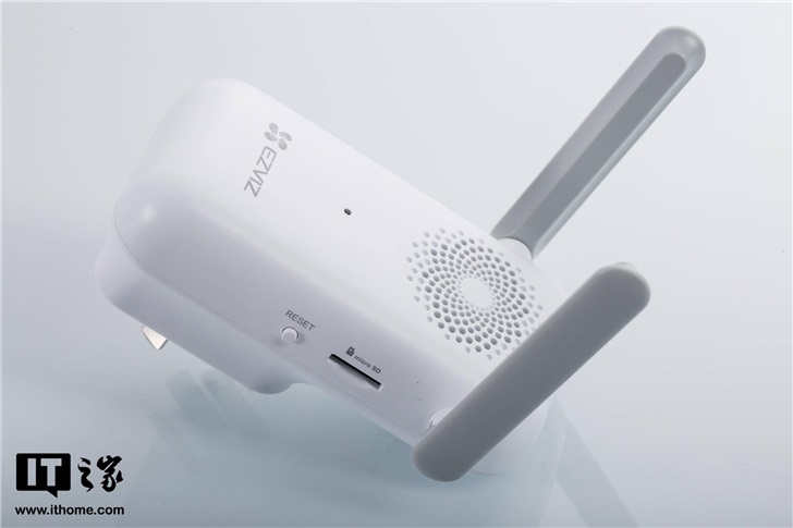 智能可视门铃室内的无线接收器采用了直插电源的设计,外形与家庭网络AP类似,两侧分别设置了两枚可以旋转的天线。正面一枚LED指示灯,上半部分为外放喇叭,背面为三相电源,侧面是配置按键与TF卡槽。