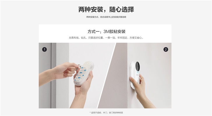 门铃提供了两种安装方式,一种是将固定板钉在墙上,这需要事先在墙上打孔,然后利用配套螺丝安装;另一种则是使用3M胶粘贴固定板,选择安装位置擦净,将胶条粘贴支架的凹槽内再粘在位置上。一般来讲用第二种方式足够了,打孔还是怪麻烦的,虽然提供了打孔定位贴纸,但没专业工具还是难以完成。值得注意的是,门铃不适合贴在金属门背后,现在很多防盗门内都有金属板,而金属会屏蔽信号,把门铃安装在门外的墙壁上即可。另外建议先将支架粘牢后静置24小时再插入主机,保证粘贴的牢靠。