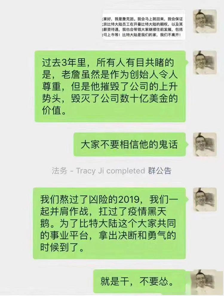 他还兴冲冲地在比特大陆的员工群里发了一条“回归宣言”,“我马上就会回来……我也会带领大家继续往前发展,包括公司上市等!”