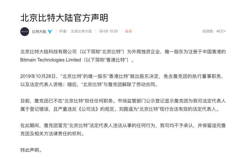 第二,比特大陆在半小时左右连发两条声明,称“詹克团领取新营业执照”是“未经比特大陆授权,无权领取比特大陆营业执照”,至于市场监管部门公示登记显示詹克团为公司法定代表人,是“登记错误”,“严重违法《公司法》的规定”。