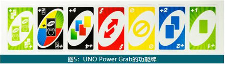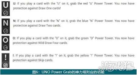 UNO Power Grab中的特殊卡牌有神力图标卡,它们看起来和普通的数字卡一样,只是多出了神力塔的符号即:U,N,O和!。