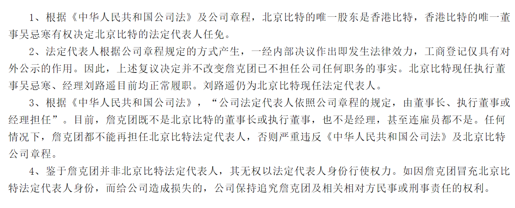 公告显示,詹克团已不在“北京比特”担任任何职务。市场监管部门公示登记显示詹克团为法定代表人属于登记错误,且严重违反《公司法》的规定。刘路遥为“北京比特”现行合法有效的法定代表人。