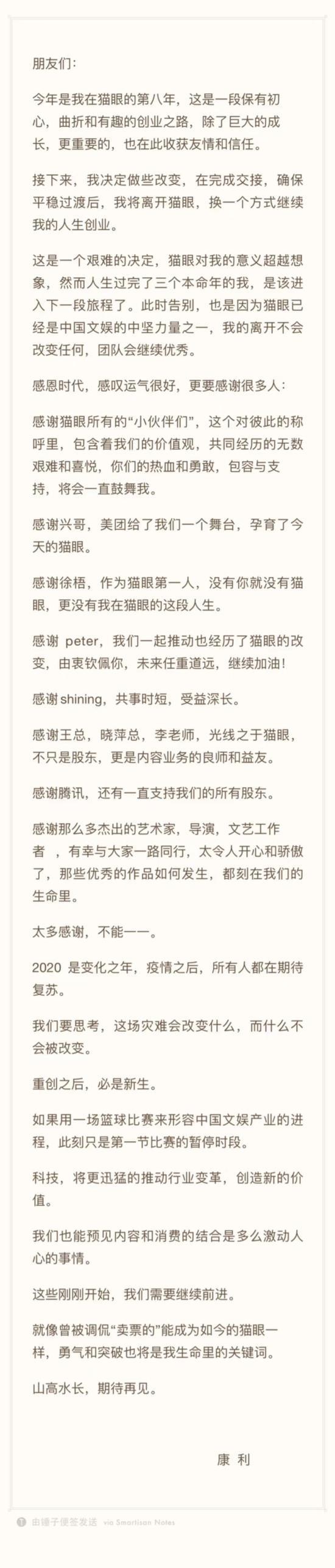 据悉,康利在朋友圈的发文中称,今年是其在猫眼的第八年,在完成交接并保证平稳过渡后,将离开猫眼,换个方式继续人生创业。对于遭受疫情重创的影视行业,他表示,如果用一场篮球比赛来形容中国文娱产业的进程,此刻只是第一节比赛的暂停时段,“重创之后,必是新生”。此外,他在文中特别感谢了美团的王兴,表示美团提供的舞台孕育出了今天的猫眼,还对光线、腾讯等猫眼股东及其高管也表达了感谢。