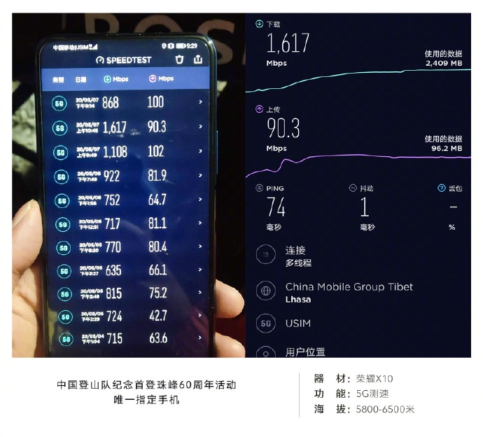 据介绍,中国登山队员在珠峰海拔5800-6500米处进行了5G测速,5G下载速度可以达到1617Mbps,上传速度达到90.3Mbps,ping值只有74ms。