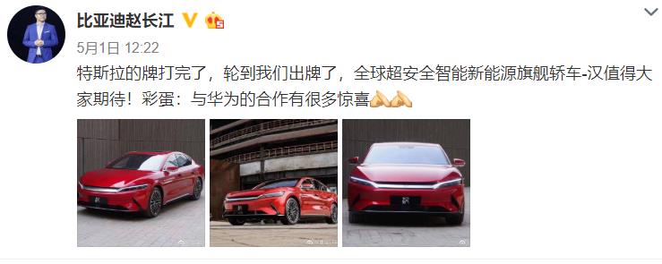 【环球网科技报道 记者 林迪】日前,记者从社交媒体了解到,比亚迪汽车销售有限公司总经理赵长江透露称,比亚迪将与华为的合作推新款智能汽车。“特斯拉的牌打完了,轮到我们出牌了,全球超安全智能新能源旗舰轿车值得期待!”