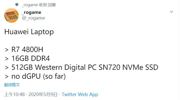 根据知名爆料者@rogame的消息,一款华为笔记本曝光,搭载了AMD R7 4800H处理器,没有独显。