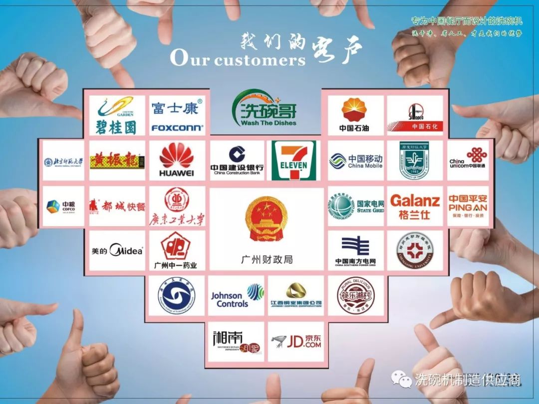 《五》、洗碗哥一路前行,给我们机关单位、学校、企业饭堂、酒楼、大小餐厅、中央厨房提供服务。如:广州财政局、广州公安局、清远人民法院、广州工商学院、广州华商学院、碧桂园集团、黄埔京东集团、大鸽饭联营、顺景海鲜酒楼等等。