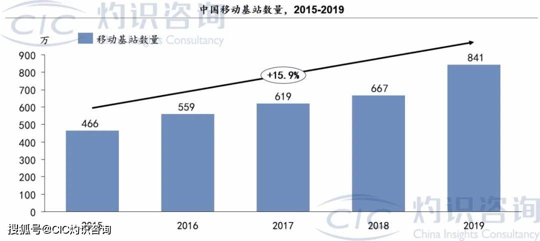 其中,以海量物联网为例。中国移动基站数量近年来逐年攀升,由2015年的466万增加至2019年的841万。