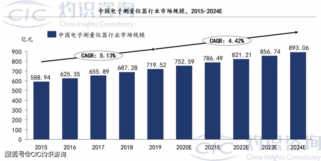 从全球来看,随着工业技术水平的持续提升、信息产业的快速发展、消费能力的不断提高,测试仪器已形成庞大的市场规模。2015年至2019年,全球无线通信与射频微波仪器市场规模从488.80亿元增长到661.86亿元,在较高基数上仍然保持了增长;2019年至2024年,全球测量测试仪器仪表的市场规模将保持5.97%的复合增长率,到2024年将达到884.64亿元。