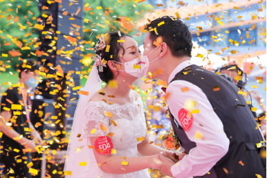 今年的阿里日很特殊,今年我们的集体婚礼也很特殊,大家都戴着口罩。当然,创意是永远是无止境的,同样一个口罩,就能有很多的创新,有很多的新的想法,有很多的点缀。对于我们所有的新人来讲,这是大家一辈子最重要的时刻。