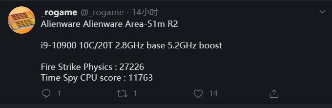 根据靠谱爆料者@rogame的消息,新款的外星人Area-51m R2搭载了i9-10900处理器,主频2.8GHz,睿频可达5.1GHz。