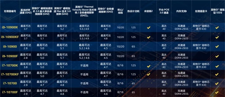 IT之家了解到,i9-10900是一款65W处理器,通过英特尔TVB加速技术可以达到单核最高5.2GHz,全核最高4.6GHz,支持双通道的DDR4 2933内存。