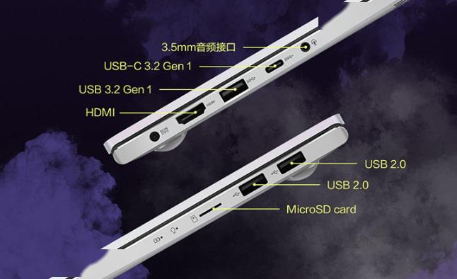 配置方面,华硕灵锐14搭载了R7 4700U处理器,8核8线程,官方称较上代的R7 3700U提升了47%,核显性能整体提升了20%。笔记本配备了16GB DDR4 3200内存和512GB SSD,还支持再加装一条M.2 SSD。接口如下图所示: