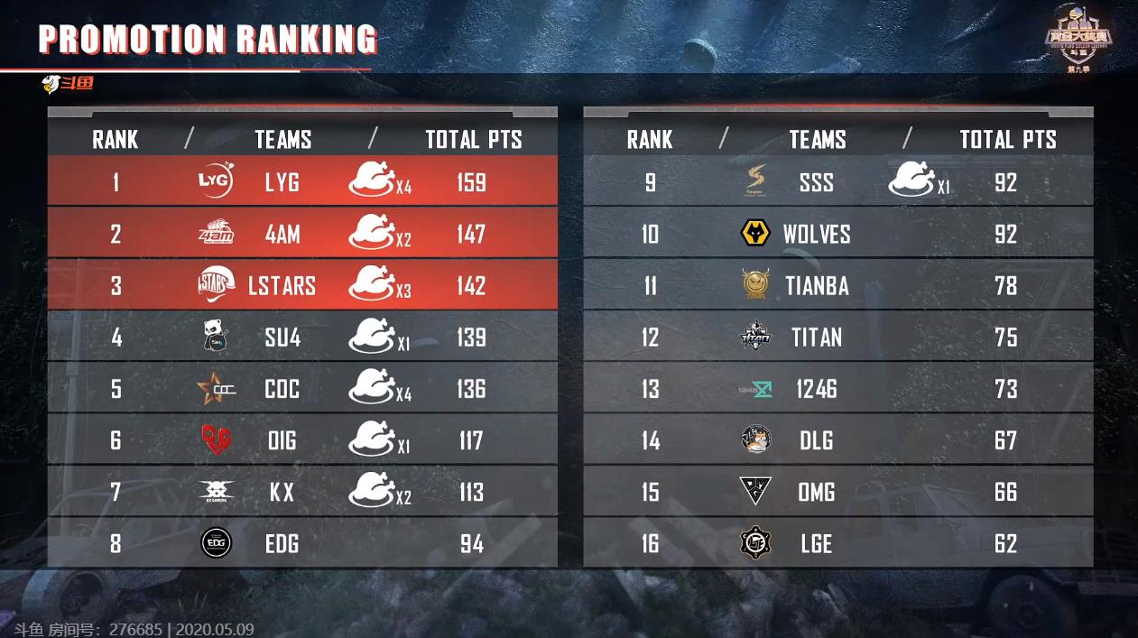下面是最终的积分排名。LYG在本次黄金大奖赛的总决赛,吃鸡4次,最终得分159 ,可以说是傲视群雄。在赛后采访中,选手表示非常激动。征战了这么长时间,终于拿到了一个冠军,感谢粉丝们的支持。4AM比Lstars高出5分,成为亚军,而Lstars成为了季军。一直都被看好的SU4和COC,最终排名第四和第五,是有点可惜的。尤其是COC,在总决赛阶段也是吃鸡4次。而孤存的OIG战队排名第六,话说回来孤存还是太嫩了,其实在比赛中还是有很多机会拿到高分的,但很可惜。周莉莉的SSS排名第九,天霸这次比赛表现一般,而OMG更是拉胯。