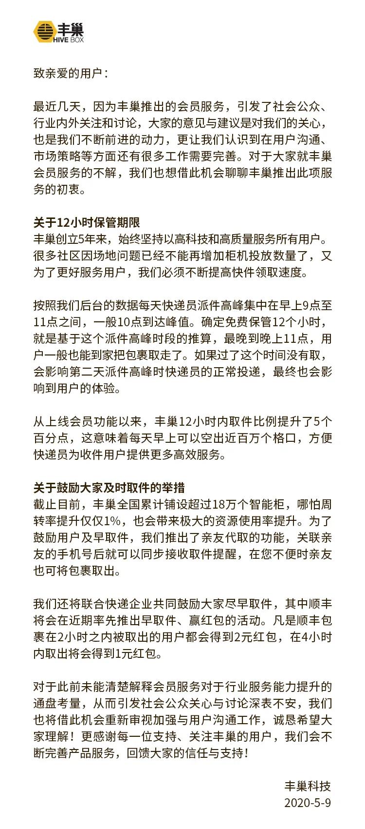 丰巢科技还表示,对于此前未能清楚解释会员服务对于行业服务能力提升的通盘考量,从而引发社会公众关心与讨论深表不安,也将重新审视加强与用户沟通工作。