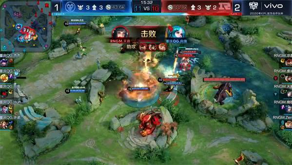最后一波团战中,双方在RNGM中路一塔处发生5V5团战(狄仁杰闪现想切掉走位靠前的西施,但被西施丝血逃脱,狄仁杰瞬间被打出贤者的庇护,廉颇进场1V3并配合蒙犽大招的导弹效果击杀掉狄仁杰,而进场想切后排的马超也被RNGM其余三人击杀,在失去两个主力输出的重庆QG团战直接溃败)!