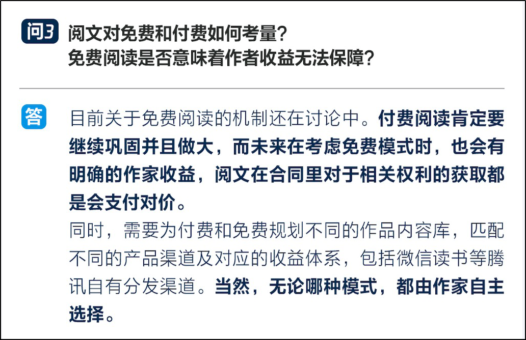 恳谈会结束后,阅文集团对外发布了一个十问十答函,明确表示,付费与免费将规划不同的作品内容库,匹配不同的产品渠道及对应的收益体系,而且,无论哪种模式,都将由作家自主选择。另外,阅文集团还就著作权等关键问题进行了回答。既明确了著作人身权归属作者不可转让,又指出未来会考虑提供多版本的合同选择,对授权权限进行分级,将更多著作产财权交给作家。
