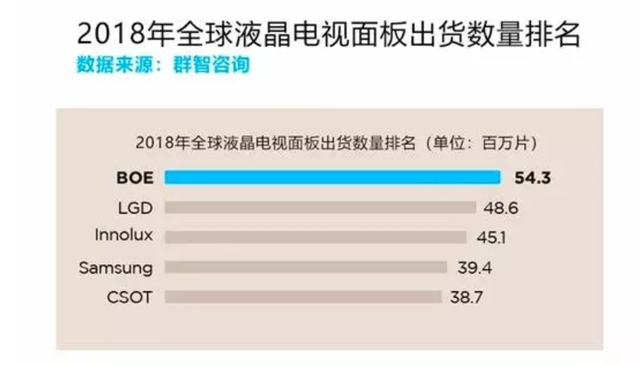 群智咨询数据显示,2018年,京东方显示屏出货量同比增长24%,高居全球第一,总面积更是增长45%,其中液晶电视面板5430万块,全球第一。