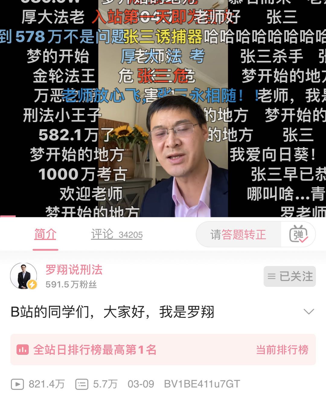 罗翔的粉丝数和视频观看量。图片来源:B站截图