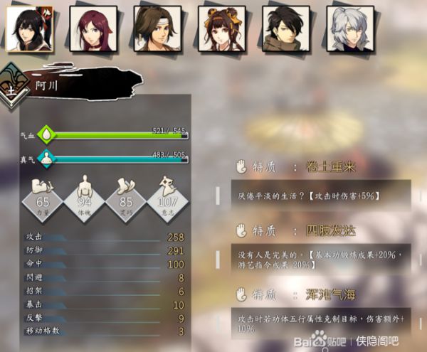 阿川的攻击258,防御291,命中100%,移动格数3,招架6%,反击9%,闪避8%,暴击10%。