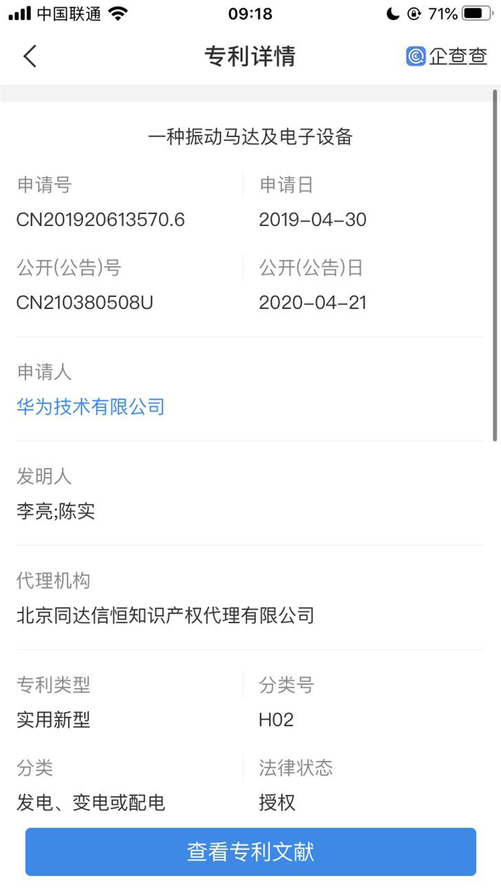 IT之家5月10日消息 据企查查数据显示,华为技术有限公司于2019年4月30日申请了“一种振动马达及电子设备”专利,该专利于2020年4月21日公开说明。