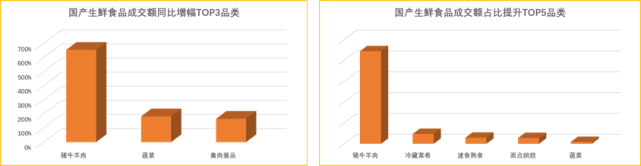 报告显示,2020年第一季度,中国品牌在抗疫情、保障民生供给、支撑经济成长等领域发挥了巨大价值:国产生鲜食品成交额同比增幅达156%,其中猪牛羊肉、蔬菜、禽肉蛋品等成交额同比增幅分别达到655%、183%、166%。与2019年第一季度对比来看,国产生鲜食品占比提升较多的品类是猪牛羊肉、冷藏菜肴、速食熟食等食品,其中猪牛羊肉成交额占比提升超过20%,并超过水果和海鲜水产,跃升为生鲜成交额占比第一的品类。