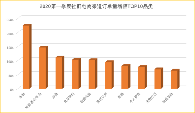 疫情下,中小型中国品牌借助社群电商获得了发展新机遇,2020年第一季度社群电商渠道订单量超出进口品牌20%。疫情期间与往年同期相比,生鲜、家庭清洁/纸品、厨具等商品订单量增幅明显。