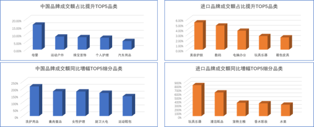 从中国品牌与进口品牌的成交额占比增速来看,中国品牌在母婴、运动、个护等品类占比增速高。从细分品类成交额增幅来看,中国品牌增幅高的品类为洗护用品、女性护理等,进口品牌则为玩具乐器、清洁纸品等。