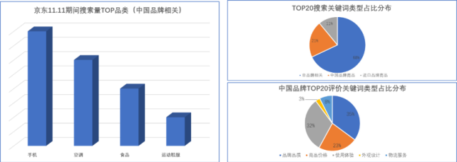从商品搜索关键词来看,搜索量TOP20关键词中32%与品牌直接相关,其中中国品牌相关关键词高出进口品牌,从11.11期间的搜索数据来看,手机国品认知度较高。从评价关键词来看,评价量TOP20关键词中品牌品质、使用体验是消费者更受消费者关注,其次为价格和服务。