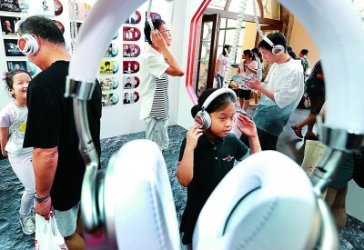 读者在上海书展现场戴上耳机感受“听书”。 新华社发
