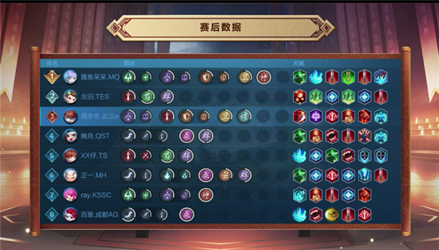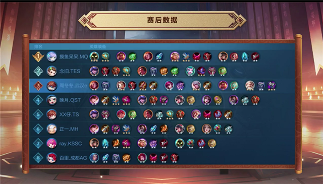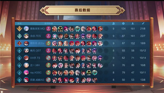 成都AG.百里三长安开局。6回合,TES.念旧满血四连胜。9回合,武汉eStar.周冬冬刷出三星鲁班七号、三星百里守约。14回合,TES.念旧蜀国阵容满血十一连胜。TS.XX仔血量降至6点。19回合,QST.晚月马超丝血一打五,险些淘汰TS.XX仔。21回合,成都AG.百里第八名被淘汰。KSSC.ray第六名被淘汰。24回合,TES念旧双青春之舞九蜀阵容被武汉eStar.周冬冬制裁克制,一波被血入。MH.正一第六名被淘汰。TS.XX仔第五名被淘汰。27回合,QST.晚月第四名被淘汰。武汉eStar.周冬冬第三名被淘汰。28回合,TES触发决死反击,关键时刻刷出三星蔡文姬。29回合,MQ摸鱼呆呆攻辅神射意外事故天赋立奇功,强行耗光时间,一波战胜TES念旧拥有双青春之舞天赋+三星蔡文姬的九蜀阵容,成功登顶。