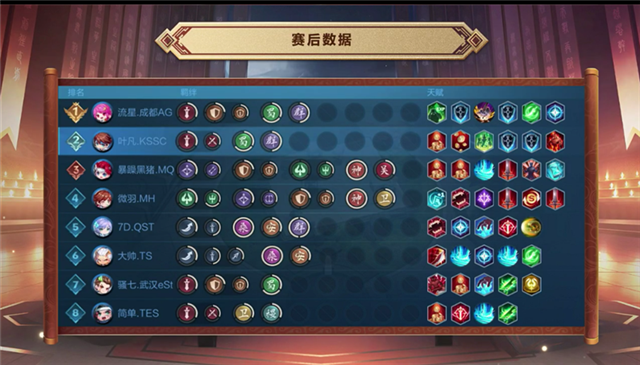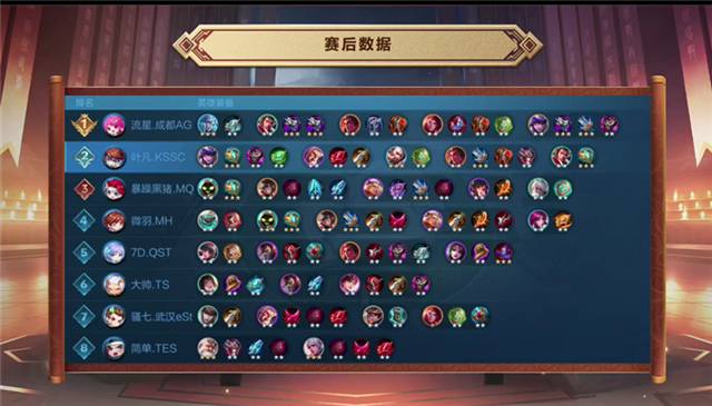 开局武汉eStar.骚七三蜀战胜拥有二星老夫子的TES.简单。7回合,TES.简单五连败,血量降至74点。11回合,KSSC.叶凡满血八连胜。12回合,TES.简单买到大部分棋子,换下长安。16回合,MH.微羽一波血入武汉eStar.骚七23滴血。17回合,TS.大帅三连败,血量降至19点。18回合,TES.简单第八名被淘汰。19回合,武汉eStar.骚七第七名被淘汰。21回合,TS.大帅第六名被淘汰。22回合,QST.7D第五名被淘汰。24回合,成都AG.流星血入KSSC.叶凡29滴血。27回合,KSSC.叶凡利用特价甩卖天赋刷出两星马超和三星曹操。27回合,MH.微羽第四名被淘汰。28回合,KSSC.叶凡血量降至1点。29回合,KSSC.叶凡三星曹操打出关键大招,成功淘汰MQ.暴躁黑猪。31回合,蜀国内战,成都AG..流星三星诸葛亮占据几大优势,最后一波在战至时间结束,击败KSSC.叶凡成功登顶。