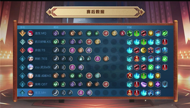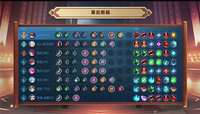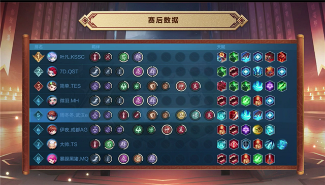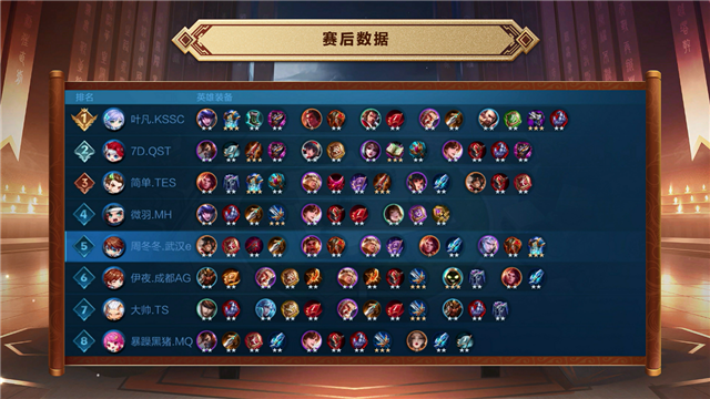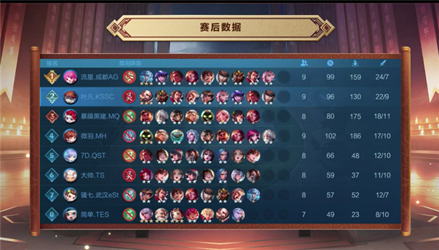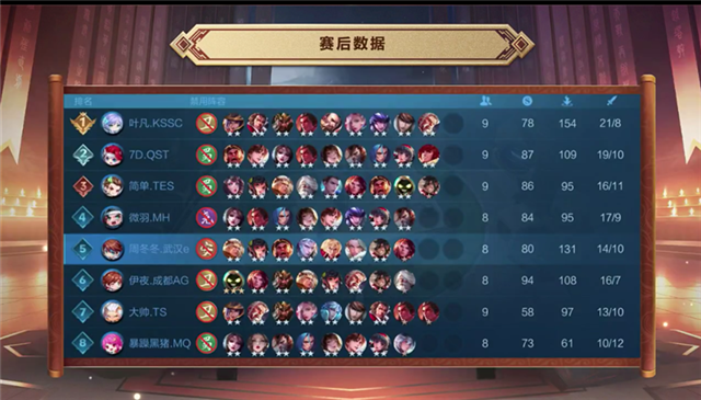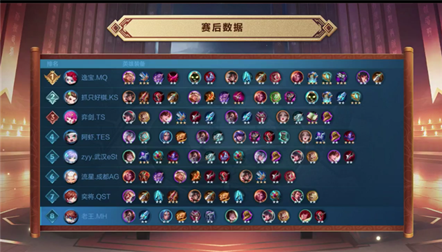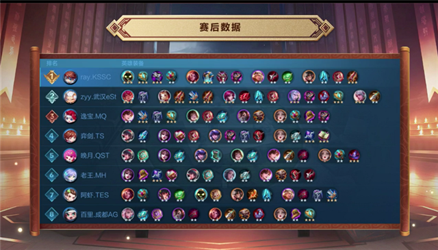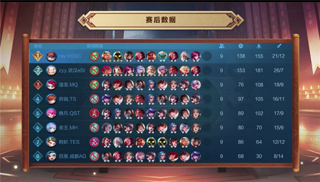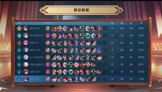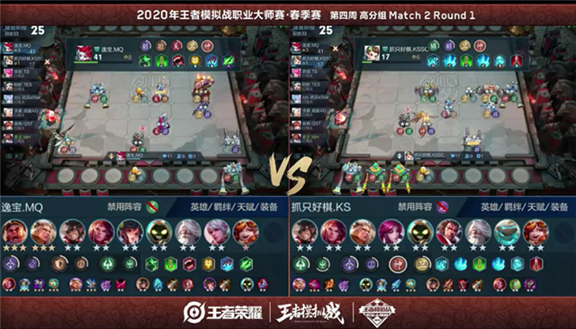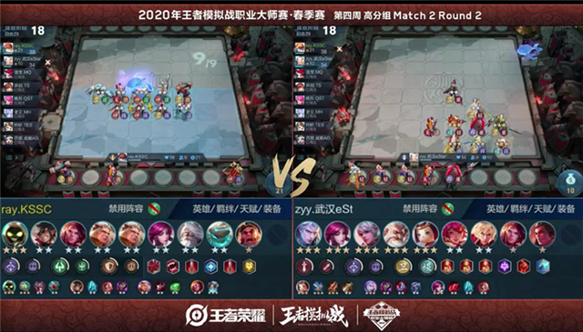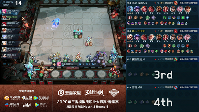 开局三家禁用蜀国。6回合,KSSC.抓只好棋满血四连胜。9回合,QST.奕将五连败,血量降至44点。17,回合,TES.阿虾战胜MH.老王稳住血量,此时9滴血。18回合,MH.老王六连败,血量降至17点。19回合,MH.老王第八名被淘汰。22回合,KSSC.抓只好棋九连胜,以83滴血暂列第一。QST.奕将第七名被淘汰。23回合,成都AG.流星第六名被淘汰。27回合,武汉eStar.zyy刷出三星上官婉儿,却第五名被淘汰。28回合,TES.阿虾第四名被淘汰。29回合,TS奕剑被淘汰。32回合,MQ.逸宝三星后羿输出位置极佳,血入KSSC.抓只好棋。33回合,MQ.逸宝拥有三星后羿、三星苏烈的攻辅神射能抗能输出,决赛圈质量碾压,成功战胜同行KSSC.抓只好棋,成功登顶。