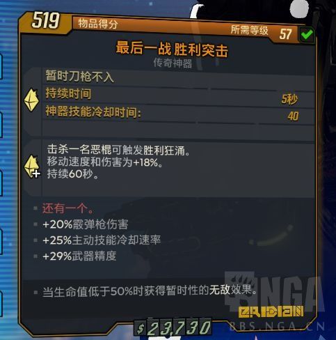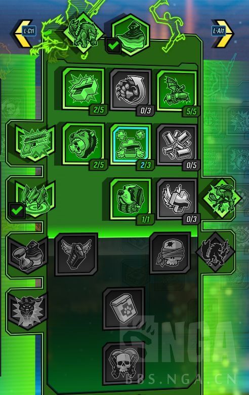 兽王的输出很足,身板很脆,所以神器要选择最后一战,胜利突击并非唯一选择,但如果追求伤害的话可以作为第一考虑,毕竟其他的词条都不太适合兽王,而最后一战在生命铠甲的-60%血量的控制下,会在受到任何伤害时无敌5秒,然后进入CD40秒,虽然看起来好像不怎么样,但是,由于护卫者技能,保证护盾满的情况下隐踪的CD很低,从而变相的提高了生存率,不需要特地切枪来打暴击刷新,选择3发的隐踪是为了配合射弹循环,搭配任意一把飞龙出击受福的武器。