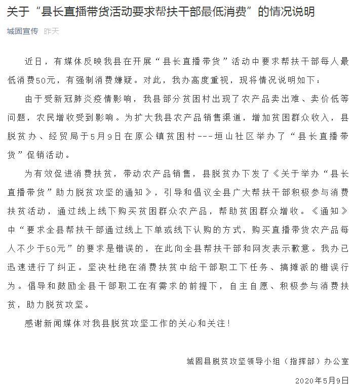 中共城固县委宣传部9日晚间消息显示,城固县脱贫办发布《关于“县长直播带货活动要求帮扶干部最低消费”的情况说明》。该说明称,近日,有媒体反映城固县在开展“县长直播带货”活动中要求帮扶干部每人最低消费50元,有强制消费嫌疑。