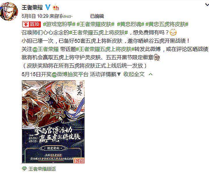 那这个活动非常的简单,虽然是只有50套,但是万一中了呢?那就不想到是这个50套的概率了,活动则是带话题转发官方王者荣耀的我微博动态,王者荣耀五虎上将皮肤即可,转发一下就好了,等待幸运的降临,这样的活动不做白不做对吧。