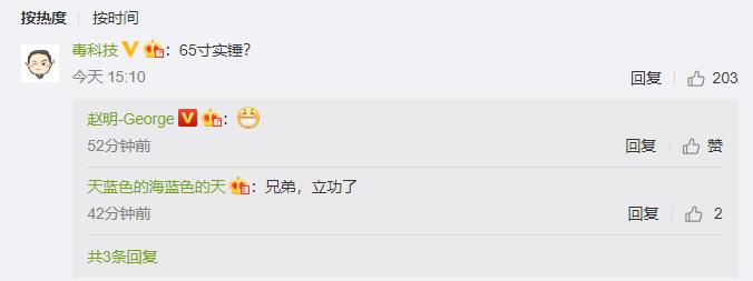 面对网友的“65英寸实锤”的疑问,赵明给与了肯定的回应。