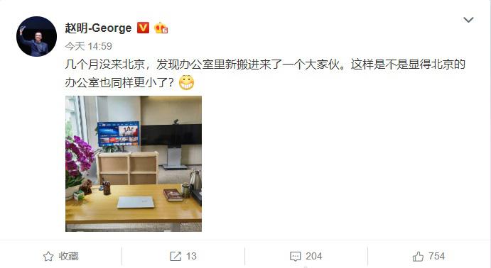 原标题:赵明晒出65英寸荣耀智慧屏,还有新款MagicBook