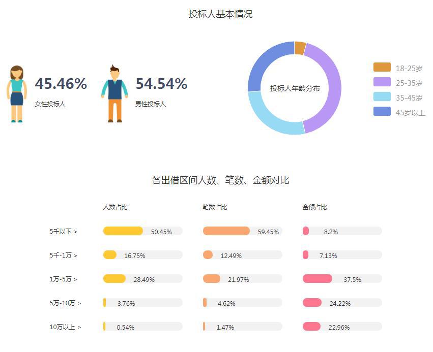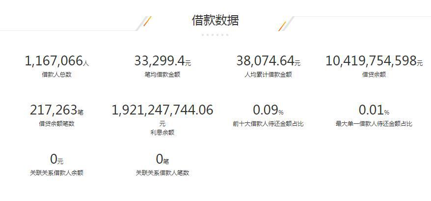 借款数据方面,目前平台借款人总数为116.71万,借贷余额为104.20亿。其中,1万-5万的借款金额占比最高,为37.5%;5万-10万的借款金额占比为24.22%,10万以上的借款金额占比为22.96%;1万以下的借款金额占比为15.33%。从数据上来看,5万以上的借款占比近半。