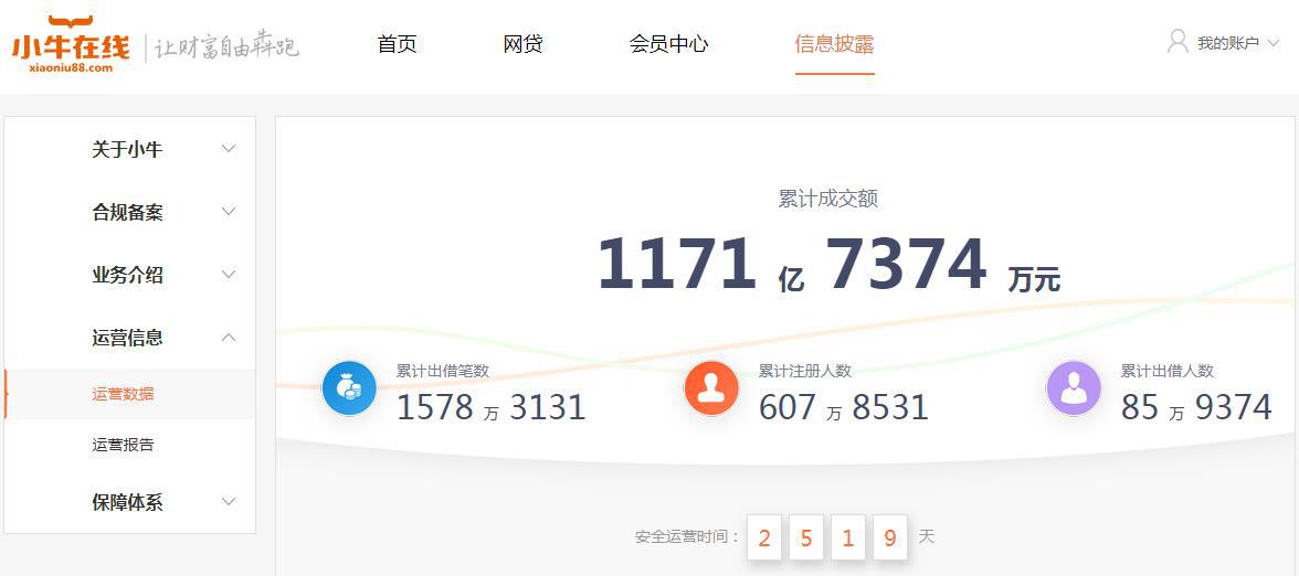 2013年6月,小牛在线P2P网贷平台上线运营,截至目前,累计成交金额1171.74亿元,累计出借1578.31万笔,累计注册人数607.85万,累计出借人数85.94万。