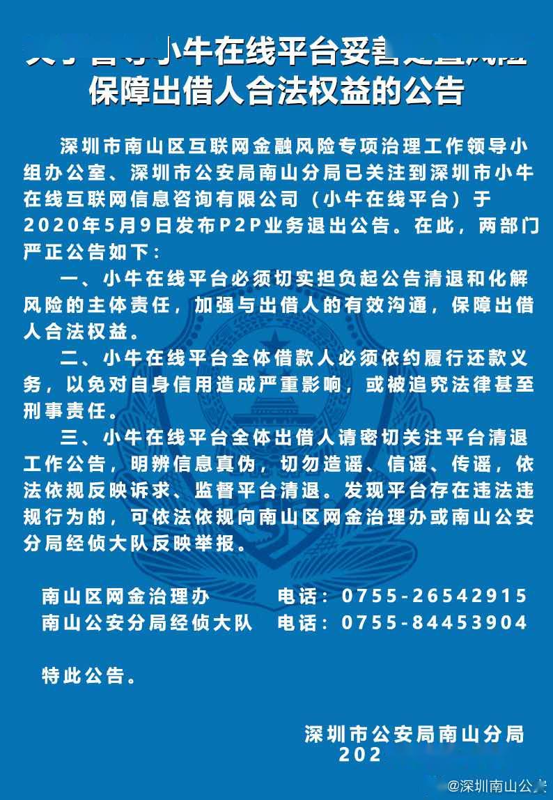 对于小牛在线宣布良性退出网贷行业一事,深圳市公安局南山分局今日(10日)发布公告称,深圳市南山区互联网金融风险专项治理工作领导小组办公室、深圳市公安局南山分局已有所关注。
