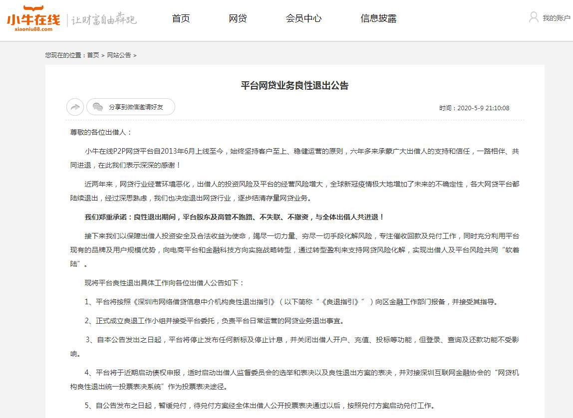 中新经纬客户端5月10日电 已上线近7年的广东P2P平台小牛在线突然宣布良性退出。日前,小牛在线发布《平台网贷业务良性退出公告》(下称《公告》)称,近两年网贷行业经营环境恶化,出借人投资风险及平台经营风险增大,疫情极大增加了未来的不确定性,各大网贷平台陆续退出,小牛在线决定退出网贷行业,逐步结清存量网贷业务。