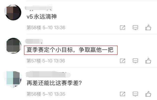 在众多网友的留言中,这位网友的评论最为中肯!这位网友表示:夏季赛定个小目标,争取赢他一把!现在对于V5来说,太需要一场胜利来恢复队员的信心了!